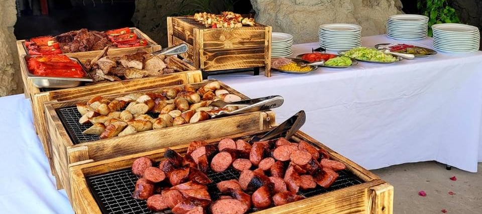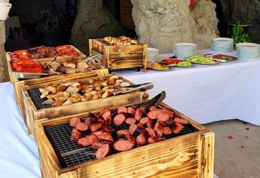 Lomo alto, secreto ibérico, chorizos parrilleros, salchichas Mano de Hierro y pinchos de pollo, con pimientos asados, papas arrugadas y ensalada de acompañamiento.